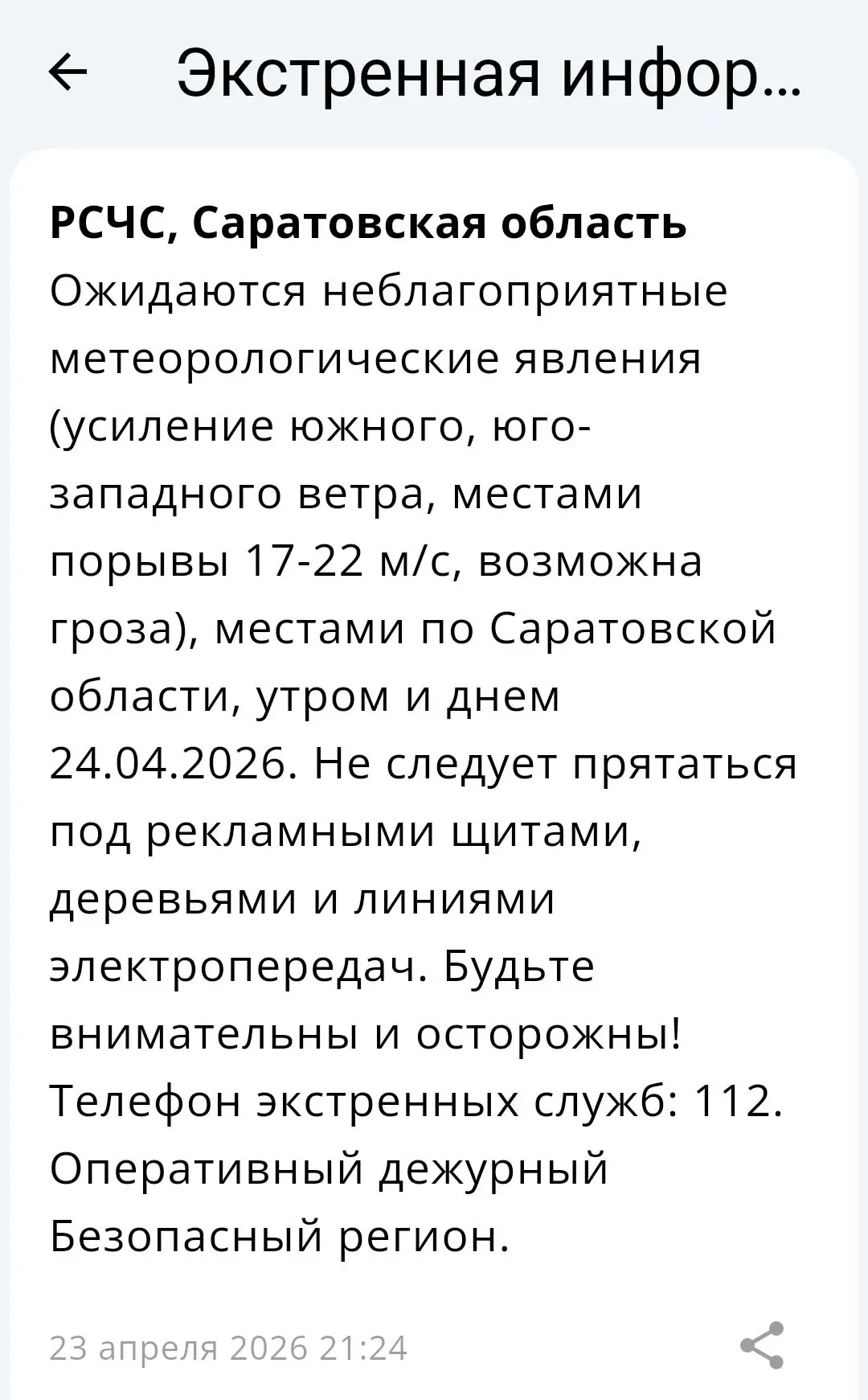 Предупреждение о сильном ветре от РСЧС