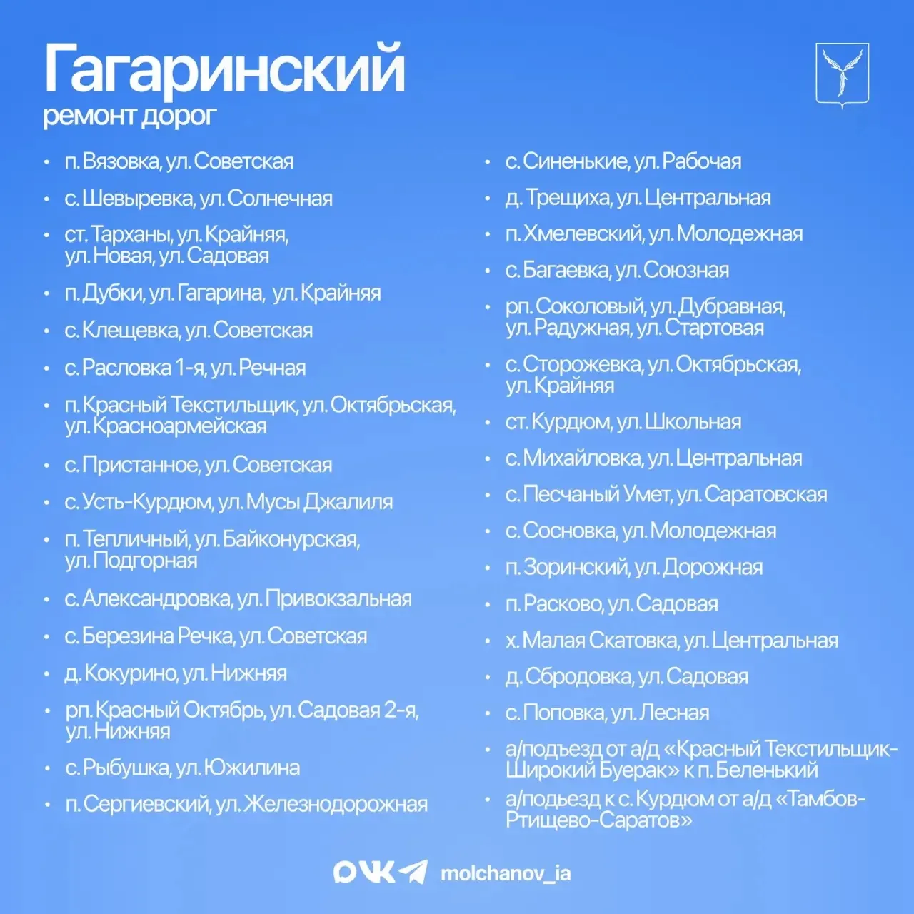 Ранее председатель Государственной Думы РФ Вячеслав Викторович Володин ставил задачу по увеличению количества дорог с асфальтовым покрытием в Гагаринском районе. В прошлом году было отремонтировано 70 участков дорог, а в текущем запланирован ремонт еще 42 участков.