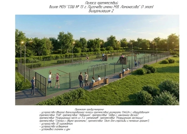 А в городе Пугачеве среди объектов, выставленных на голосование, есть полоса препятствий возле общеобразовательной школы. Двойная военизированная полоса с оборудованием: «Забор с наклонной доской», «Лабиринт» и «Ров». Такие учебно-тренировочные комплексы помогают школьникам поддерживать физическую форму и укреплять здоровье, знакомит их с основами военной службы.