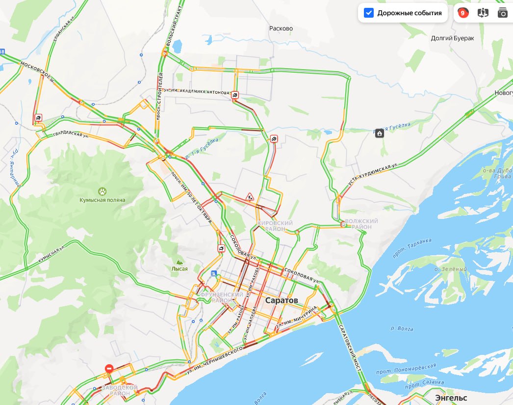 В Саратове пробки 9 баллов. Движение затруднено на улицах Рахова, Астраханская, Чапаева, Соколовая, Шелковичная, Танкистов и местами на Чернышевского.