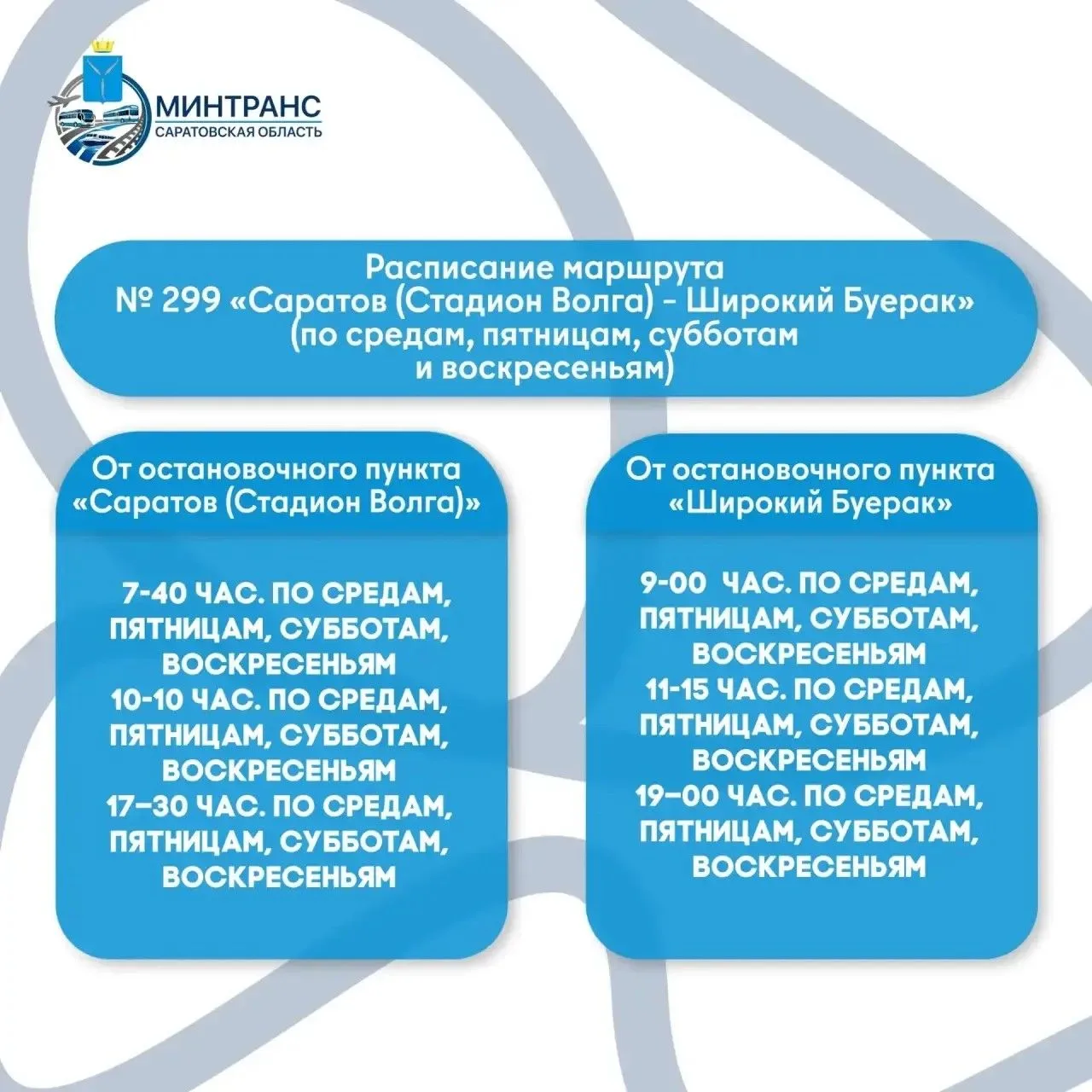 С 1 мая на межмуниципальном маршруте регулярных перевозок пригородного сообщения № 299 «Саратов (Стадион Волга) – Широкий Буерак» вводятся 2 дополнительных рейса. Движение автобусов будет осуществляться по средам, пятницам, субботам и воскресеньям, сообщает Минтранс региона.